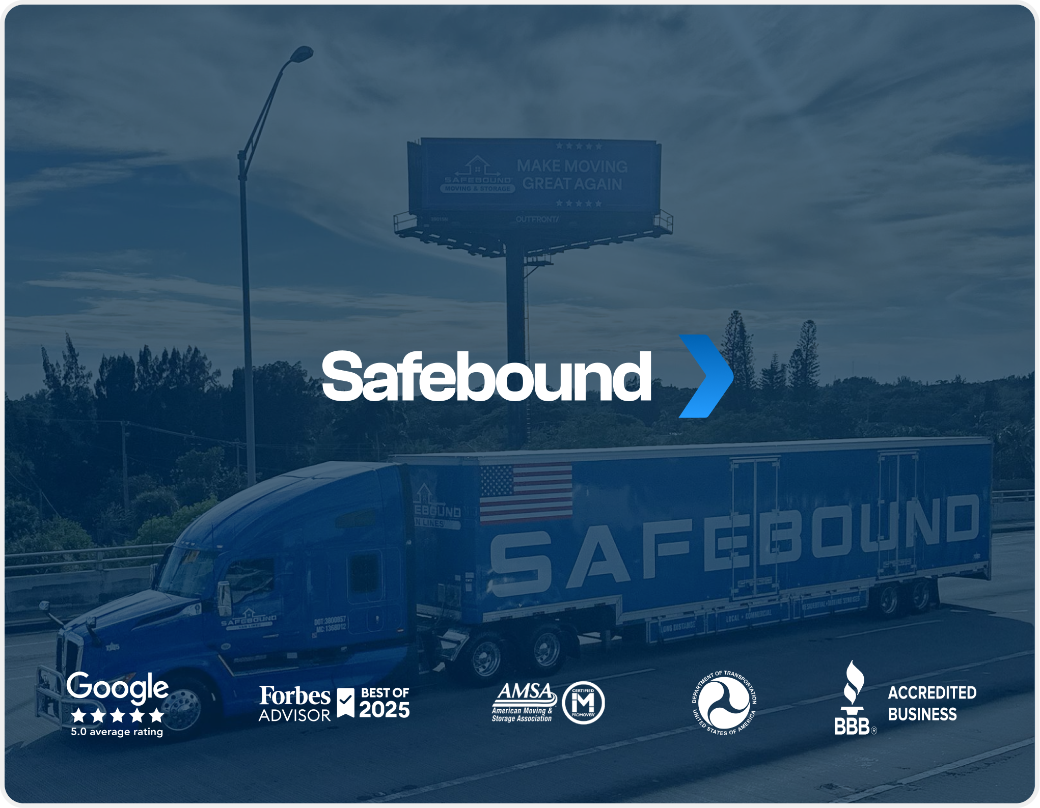 Safebound Moving & Storage holds USDOT 2900155, MC MC00975408, and Florida license IM2839 with $750,000 in insurance coverage. BBB Accredited, ProMover Certified, AMSA Member, and Forbes Featured. License verification: fdacs.gov | safer.fmcsa.dot.gov